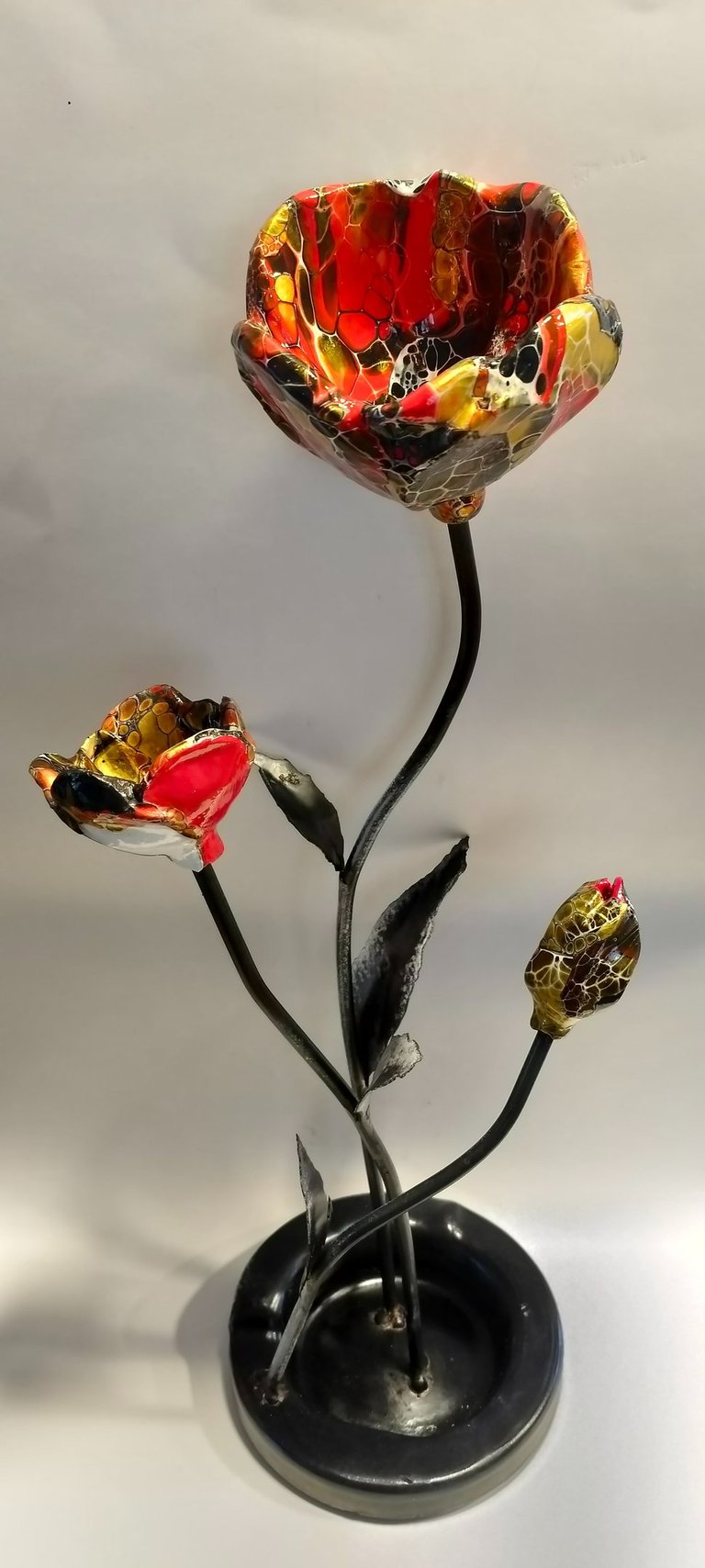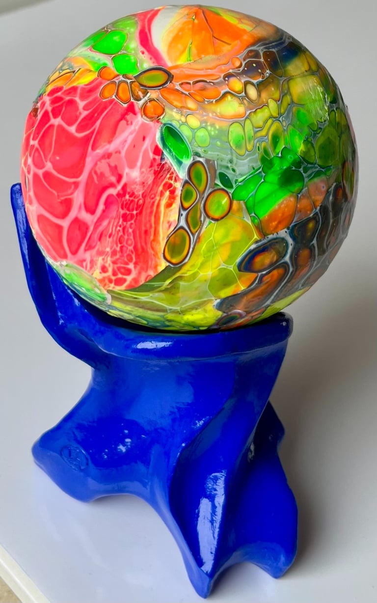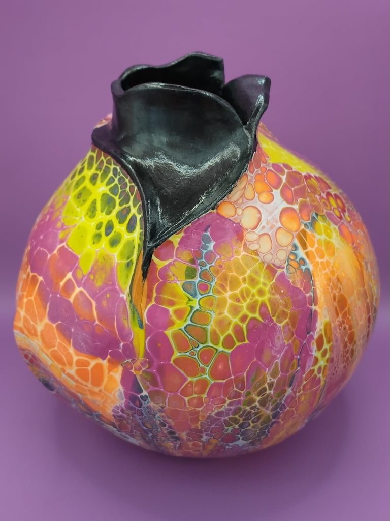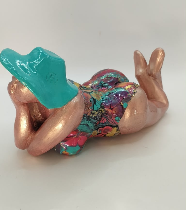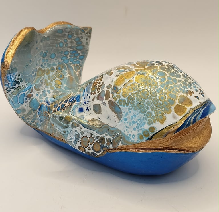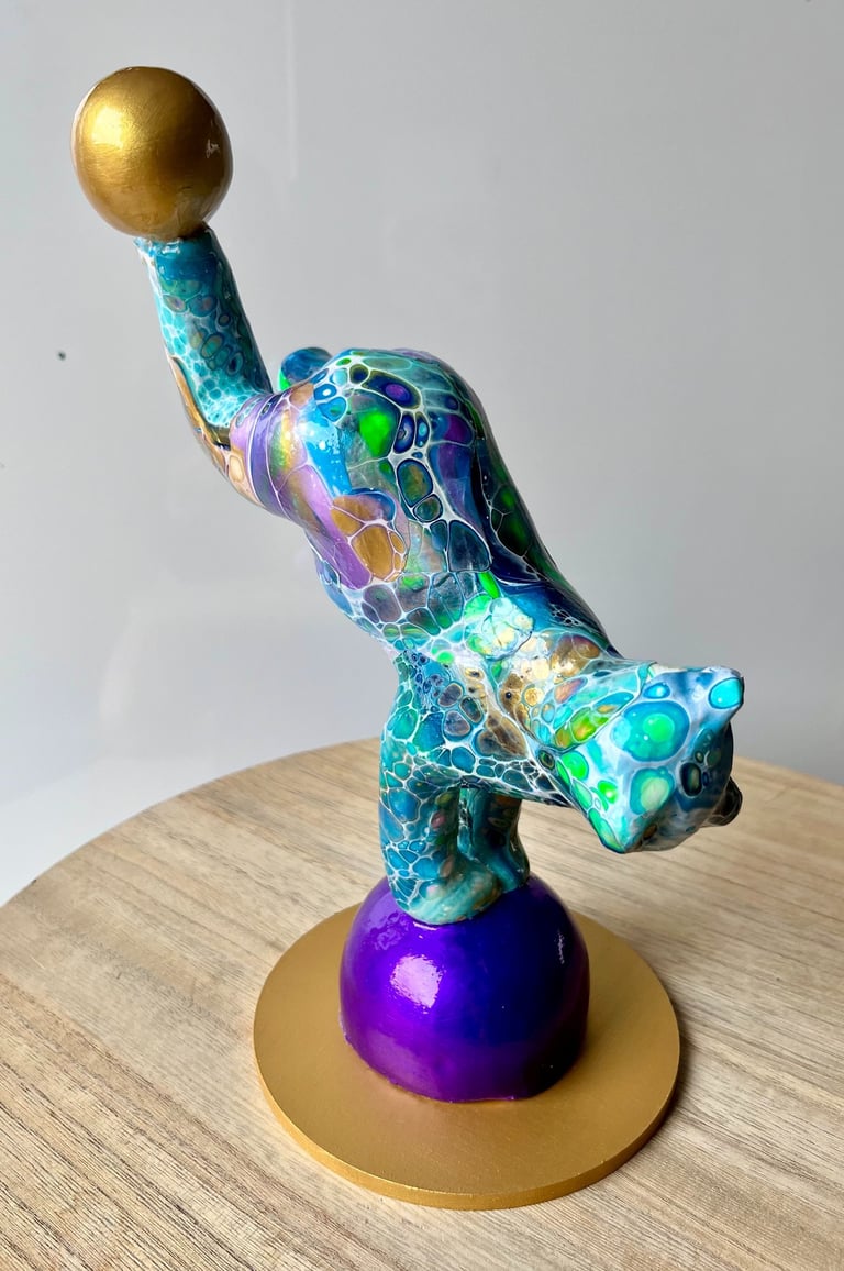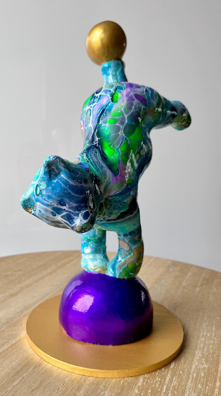 J’ai rencontré Graziella Bertrand, sculptrice de céramique d’art (Terre et Mains) lors d’un salon. De là est née une belle amitié et nous avons eu l’idée de combiner nos 2 mondes. Graziella, elle, travaille les sculptures entièrement à la main, sans moule et moi les décorations en fabriquant des peaux de mélanges de peintures et médiums qui une fois sèches se plastifient…il ne me reste plus qu’à les assembler sur ses sculptures.